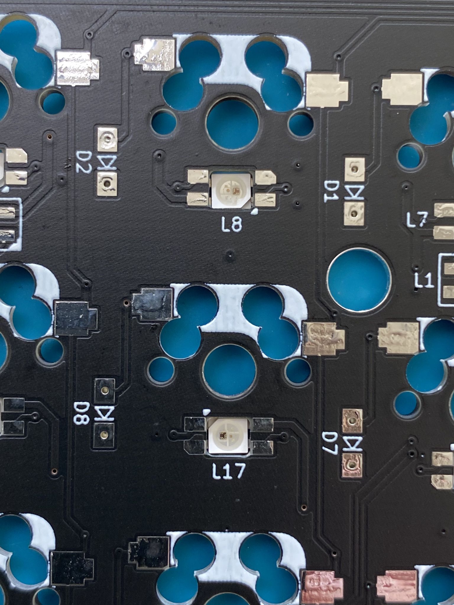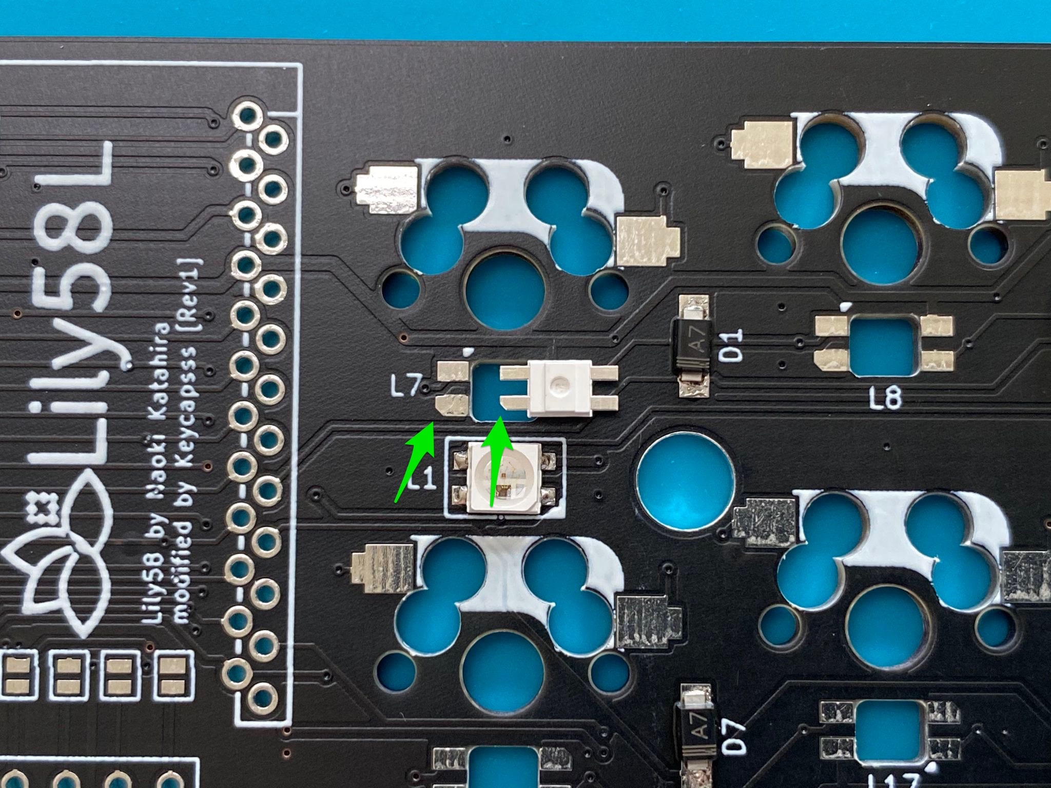 It is necessary to solder all WS2812 LED's (underglow) in the previous step, to use the LED's for the per switch RGB (all LED's are connected in series).